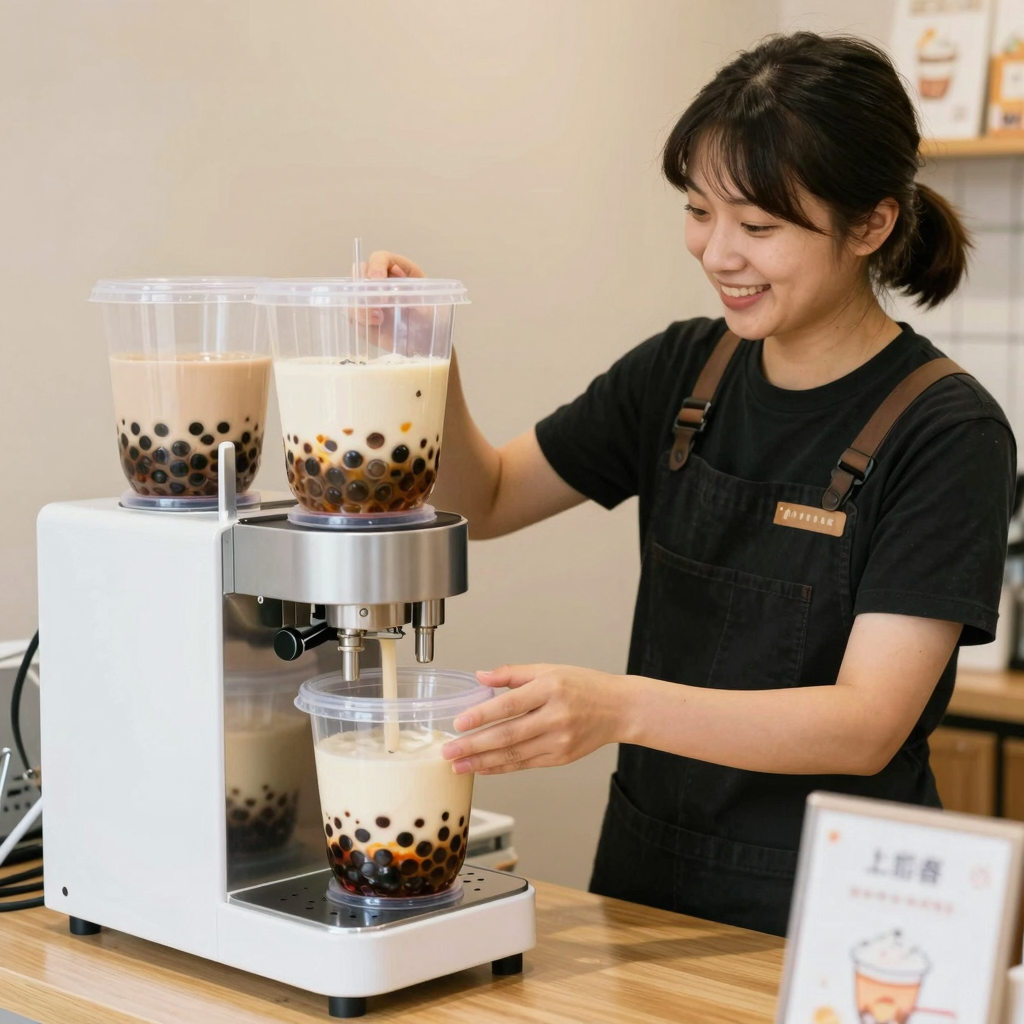 A happy bubble tea shop owner using a low price plastic food container making machine.
