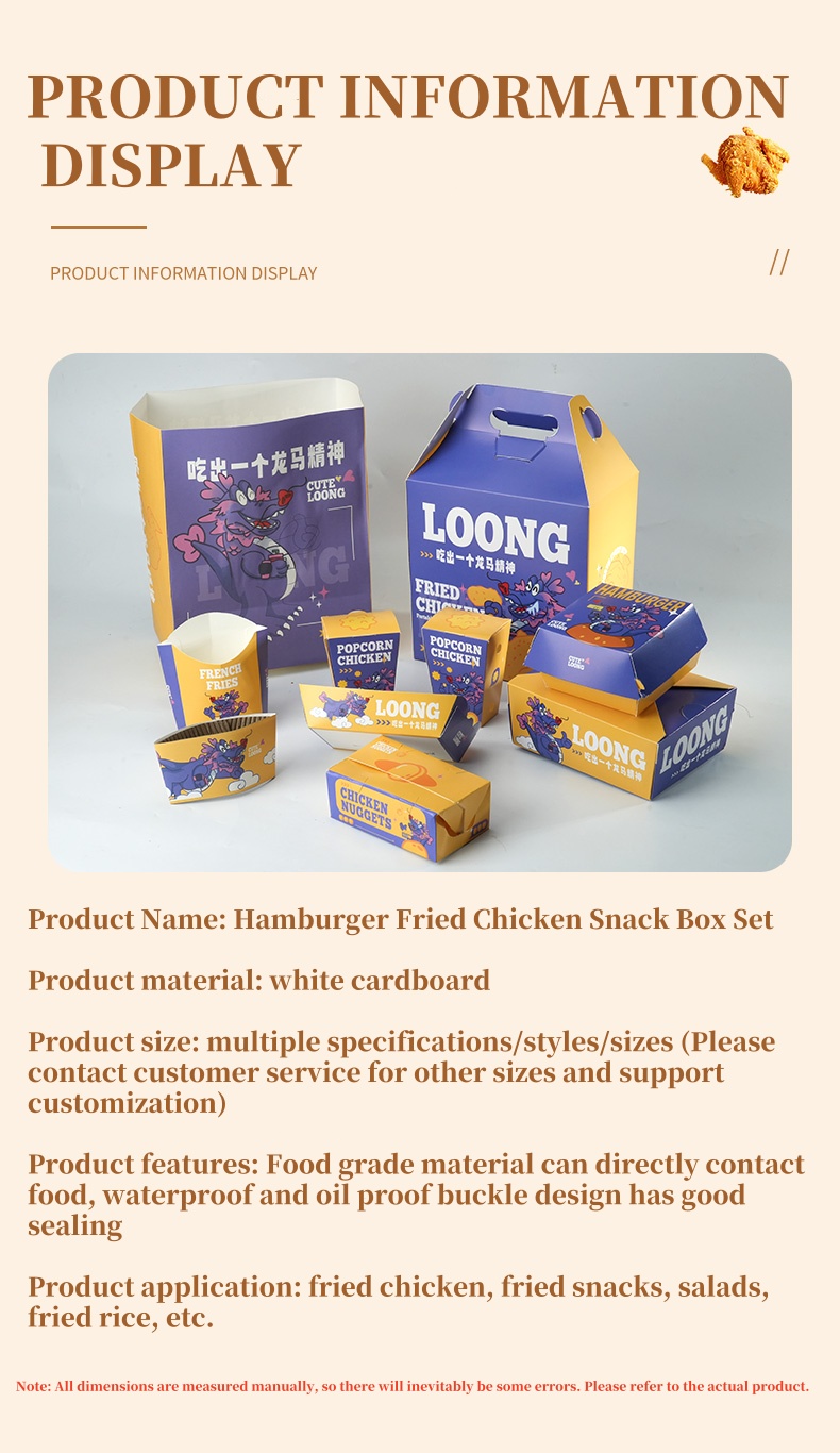 Size   Chicken Boxes Hamburger Boxes Food Trays French Fries Boxes Chicken Nuggets Boxes Heat Seal Packaging Box Cup Sleeves Fried Chicken Boxes S-size Pizza Box L-size Pizza Box XL-size Pizza Box XXL-size Pizza Box