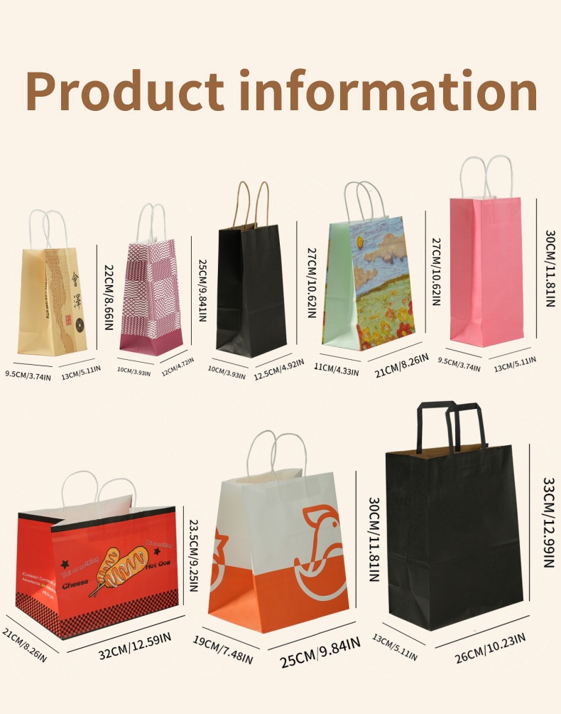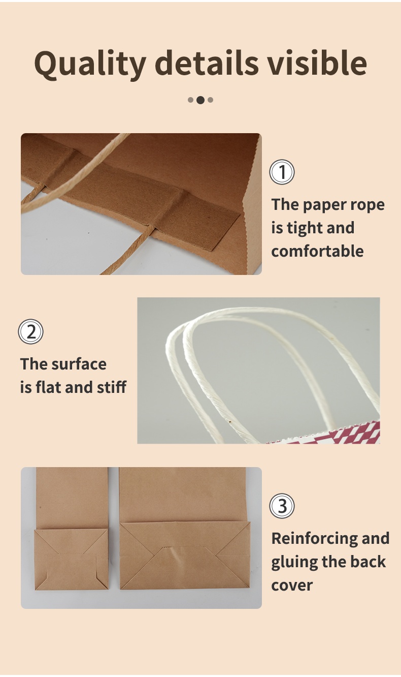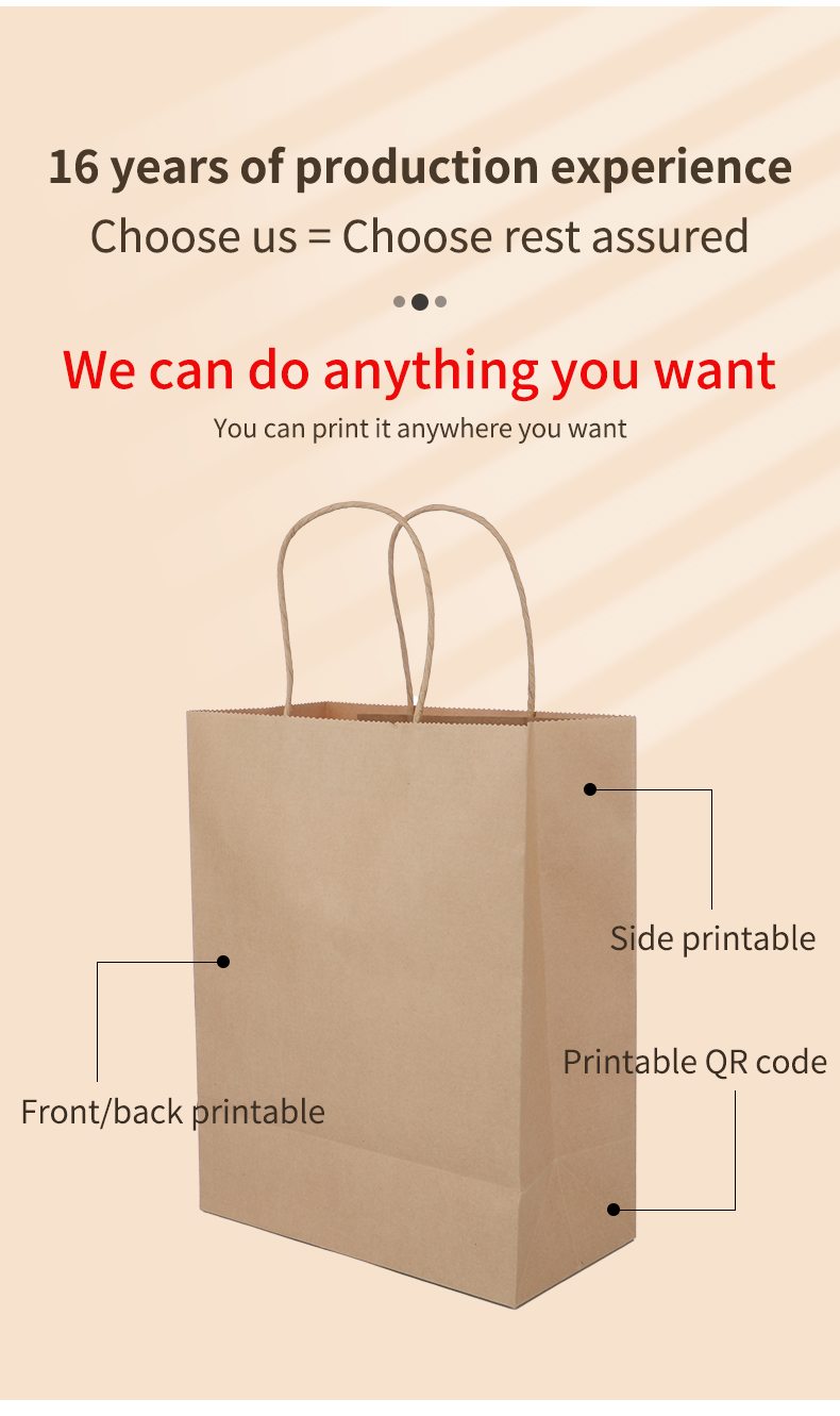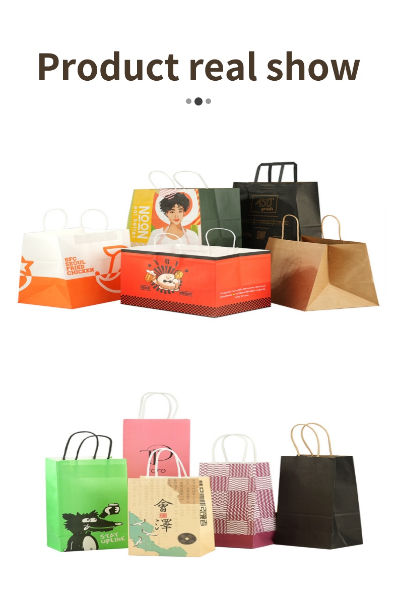 This Uchampak high-quality kraft paper tote bag is made from durable, food-grade paper. The bag is thick and strong, with reinforced handles for easy carrying. Custom branding is available, with a variety of sizes and finishes available, helping businesses create a consistent and refined packaging image. Our factory is equipped with fully automated bag-making and printing equipment, enabling high-volume production and reliable delivery, ensuring each bag is both aesthetically pleasing and practical.