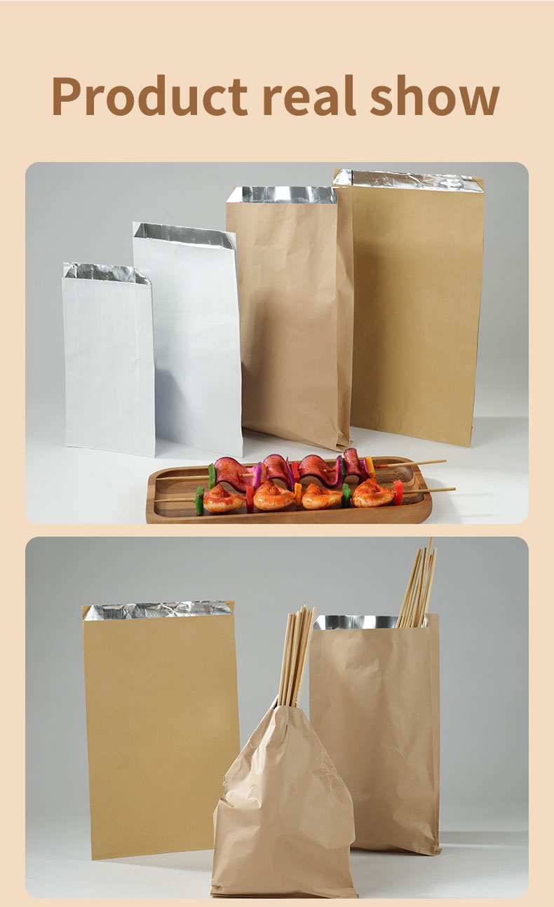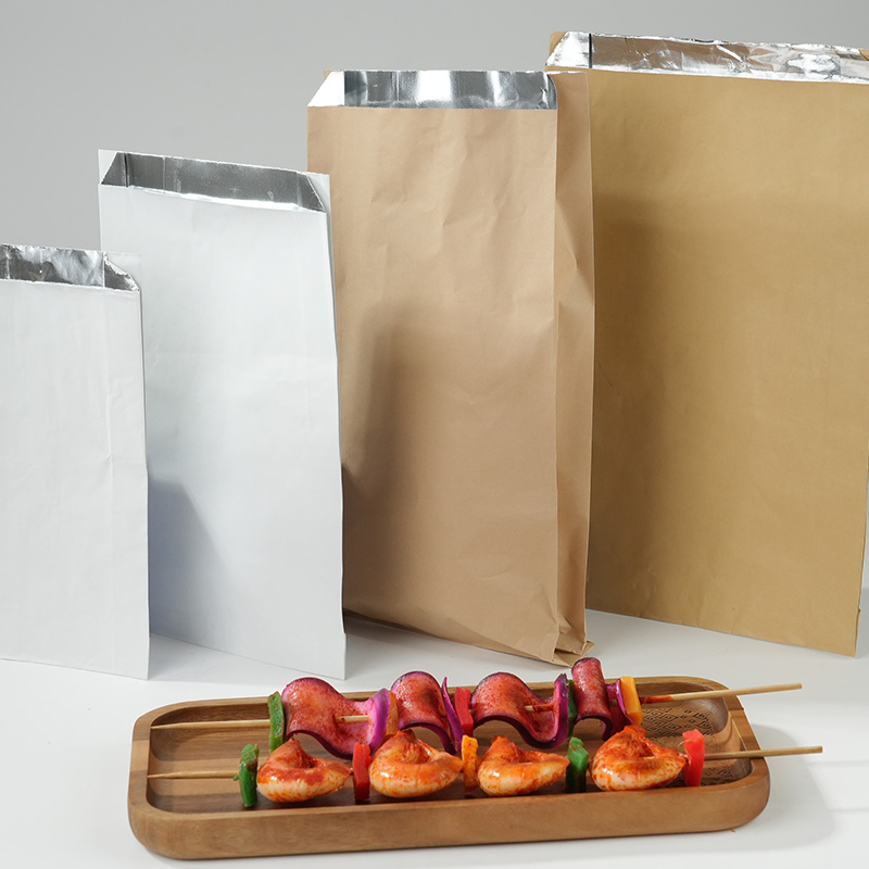 This Uchampak custom aluminum foil food bag is crafted from a laminate of food-grade kraft paper and aluminum foil, offering excellent oil and water resistance and heat insulation. The durable bag easily and neatly holds a variety of foods. Custom printing is available to enhance the packaging’s visual appeal and brand impact. Our factory, equipped with advanced laminating and printing equipment, boasts high-volume production capabilities and rigorous quality control, ensuring consistent delivery of every order, meeting the diverse needs of the catering and retail industries.